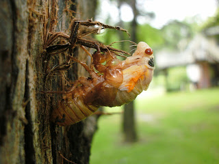 This spring I raked wet leaves and lifted up flat rocks to find worms for feeding my Koi fish. To my surprise I would keep seeing tons of 1/4 inch holes in the ground, empty or with a little Cicada head popping out. I didn't know they lived for 13 years in an 10" underground hole. They are everywhere. Today I looked at the trunks of trees- they are covered with Cicadas....it really is amazing, and within the next 2 weeks you will begin to hear them and then they will die a month later....